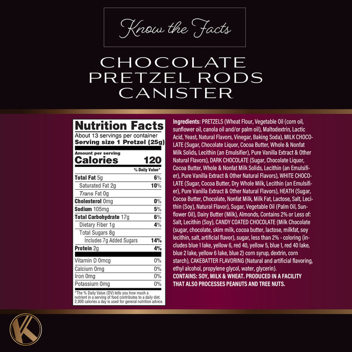 Ingredients: PRETZELS (Wheat Flour, Vegetable Oil (corn oil, Nutrition Facts sunflower oil, canola oil and/or palm oil), Maltodextrin, Lactic Acid, Yeast, Natural Flavors, Vinegar, Baking Soda), MILK CHOCO- LATE (Sugar, Chocolate Liquor, Cocoa Butter, Whole & Nonfat Milk Solids, Lecithin (an Emulsifier), Pure Vanilla Extract & Other Natural Flavors), DARK CHOCOLATE (Sugar, Chocolate Liquor, Cocoa Butter, Whole & Nonfat Milk Solids,Lecithin (an Emulsifier), Pure Vanilla Extract & Other Natural Flavors), WHITE CHOCOLATE (Sugar, Cocoa Butter, Dry Whole Milk, Lecithin (an Emulsifier), Pure Vanilla Extract & Other Natural Flavors), HEATH (Sugar, Cocoa Butter, Chocolate, Nonfat Milk, Milk Fat, Lactose, Salt, Lecithin (Soy), Natural Flavor), Sugar, Vegetable Oil (Palm Oil, Sunflower Oil), Dairy Butter (Milk), Almonds, Contains 2% or Less of: Salt, Lecithin (Soy), CANDY COATED CHOCOLATE (Milk Chocolate (sugar, chocolate, skim milk, cocoa butter, lactose, milkfat, soy lecithin, salt, artificial flavor), sugar, less than 2% - coloring (includes blue 1 lake, yellow 6, red 40, yellow 5, blue 1, red 40 lake, blue 2 lake, yellow 6 lake, blue 2) corn syrup, dextrin, cornstarch), CAKEBATTER FLAVORING (Natural and artificial flavoring, ethyl alcohol, propylene glycol, water, glycerin).