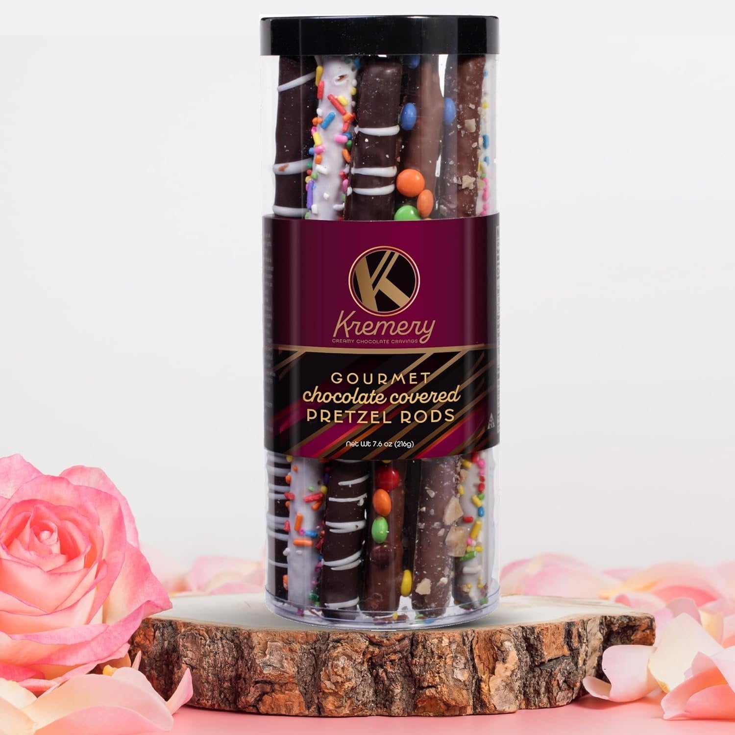 Experience gourmet delights with Kremery's Chocolate Covered Pretzel Rods! This exquisite gift set features 8 individually wrapped pretzel rods, each blanketed in rich milk chocolate and crowned with a unique topping. Presented in an elegant clear tube, our gift set is the perfect way to share and savor the Kremery experience.