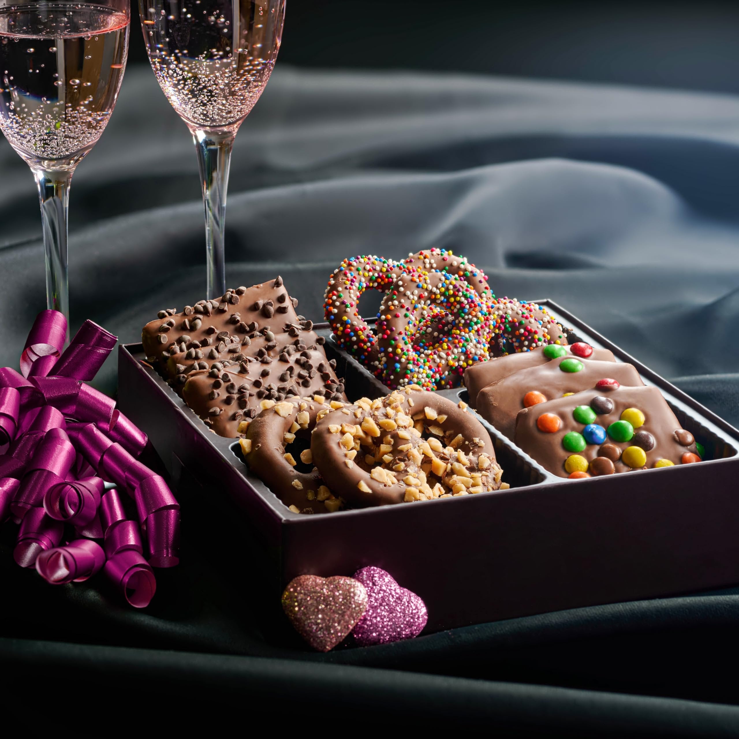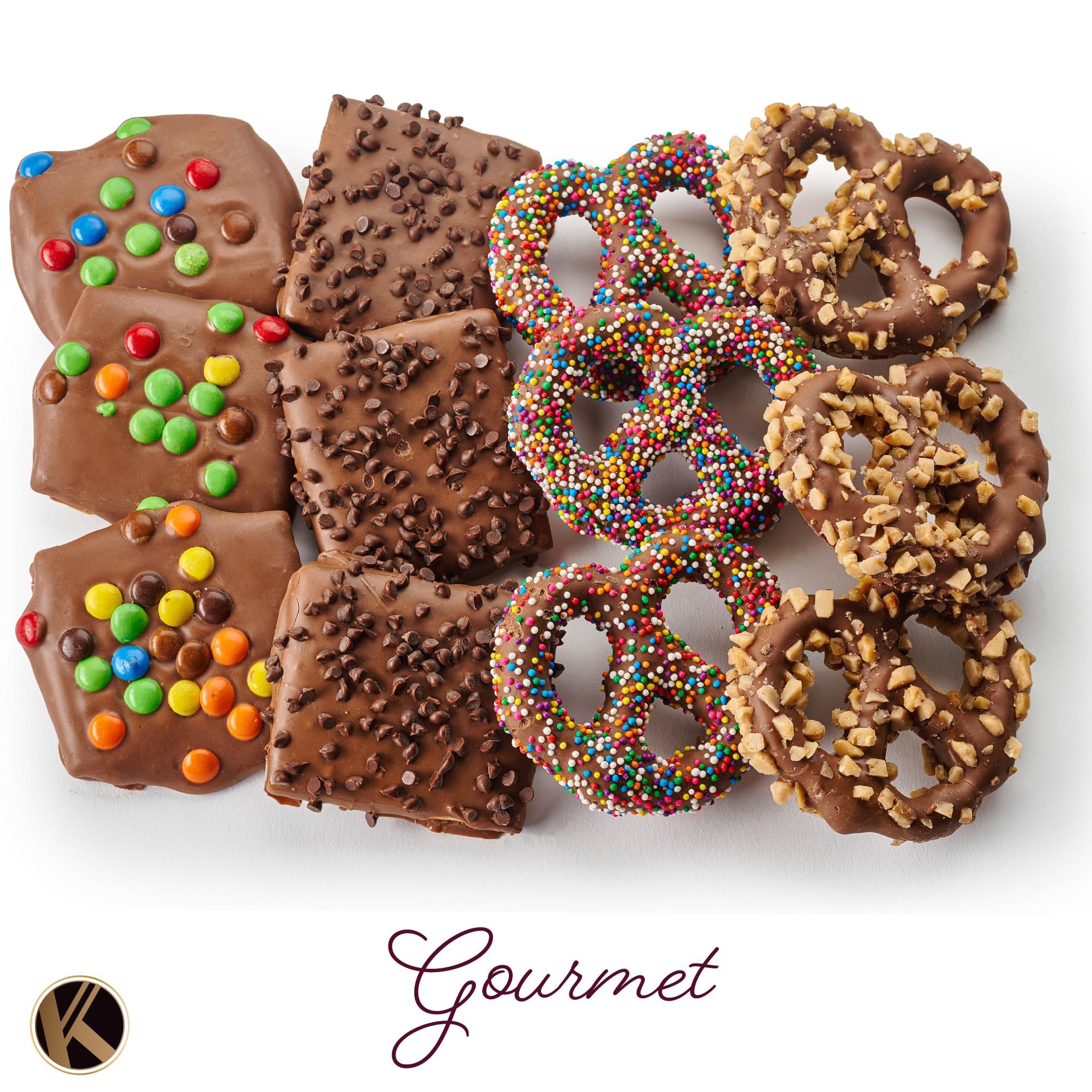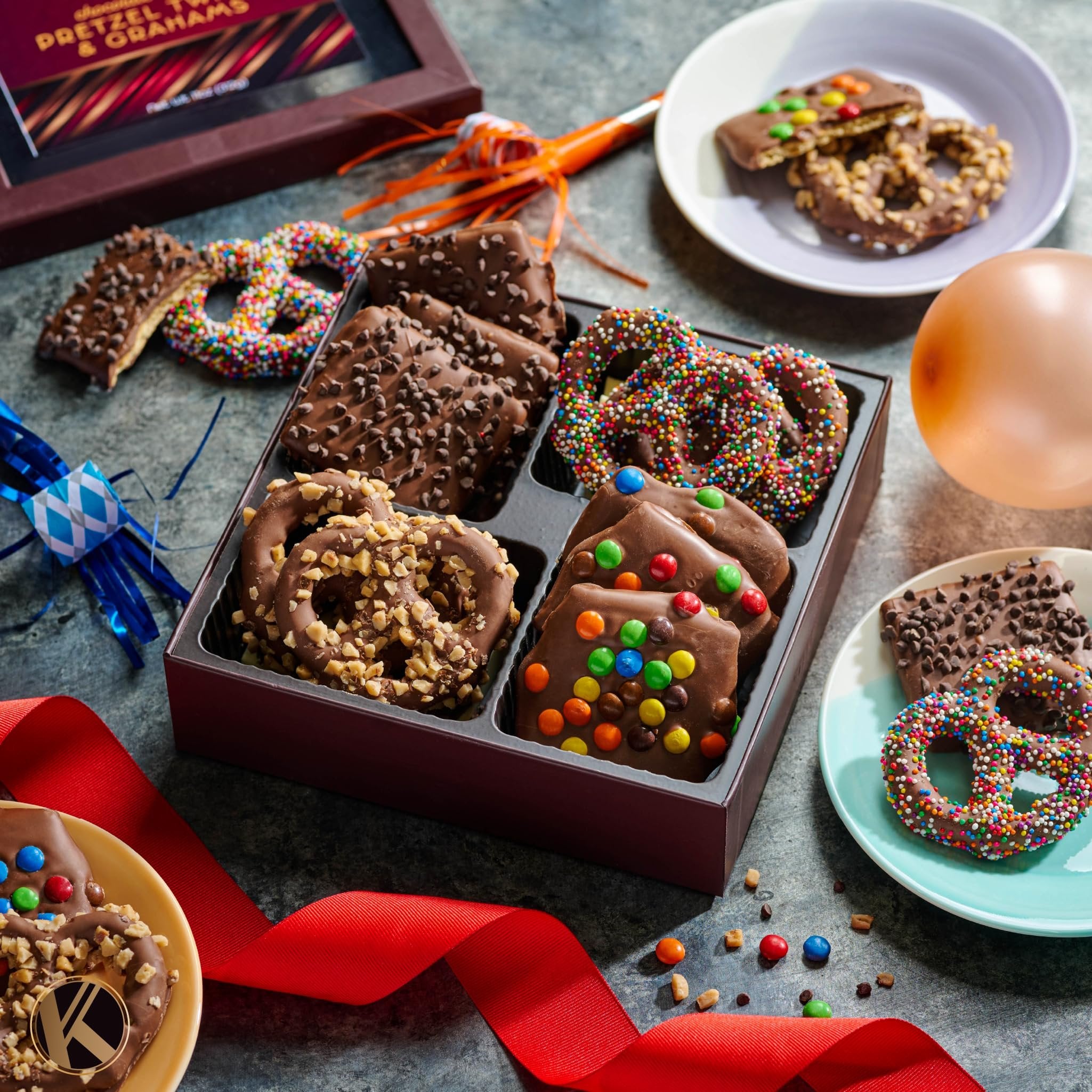 • ASSORTED GOURMET TREATS: Enjoy a mix of 12 milk chocolate-covered pretzel twists and graham crackers, each topped with fun and delicious toppings like mini chocolate chips, rainbow nonpareils, M&Ms, and crushed Heath toffee.