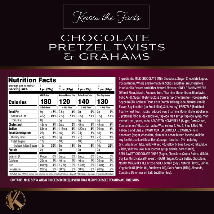MILK CHOCOLATE (Milk Chocolate, Sugar, Chocolate Liquor, Cocoa Butter, Whole and Nonfat Milk Solids, Lecithin (an Emulsifier), Pure Vanilla Extract and Other Natural Flavors HONEY GRAHAM WAFER (Wheat Flour, Niacin, Reduced Iron, Thiamine Mononitrate, Riboflavin, Folic Acid), Sugar, High Fructose Corn Syrup, Shortening (Hydrogenated Soybean Oil), Graham Flour, Corn Starch, Baking Soda, Natural Vanilla Flavor, Soy Lecithin (an Emulsifier), Salt, Honey) PRETZELS (Enriched flour (wheat flour, niacin, reduced iron, thiamine Mononitrate, riboflavin, 3 pretzels) folic acid), canola oil, tapioca malt syrup (tapioca syrup, malt extract), salt, yeast, soda, ASSORTED NONPAREILS (Sugar, Corn Starch, Confectioners' Glaze, Carnauba Wax, Yellow 5, Red 3, Blue 1, Red 40, Yellow 6 and Blue 2) CANDY COATED CHOCOLATE CANDIES (milk chocolate (sugar, chocolate, skim milk, cocoa butter, lactose, milkfat, soy lecithin, salt, artificial flavor), sugar, less than 2% - coloring (includes blue 1 lake, yellow 6, red 40, yellow 5, blue 1, red 40 lake, blue 2 lake, yellow 6 lake, blue 2) corn syrup, dextrin, corn starch), SEMI-SWEET CHOCOLATE CHIPS (Sugar, Chocolate, Cocoa Butter, Milkfat, Soy Lecithin, Natural Flavors), HEATH (Sugar, Cocoa Butter, Chocolate, Nonfat Milk, Milk Fat, Lactose, Salt, Lecithin (Soy), Natural Flavor), Sugar, Vegetable Oil (Palm Oil, Sunflower Oil), Dairy Butter (Milk), Almonds, Contains 2% or less of: Salt, Lecithin (Soy).